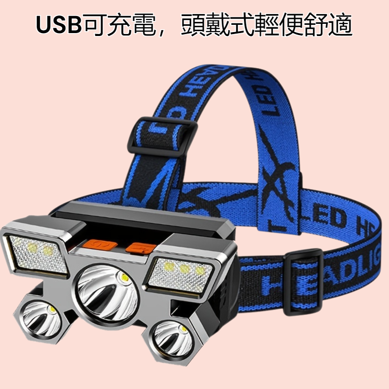 LED五核頭燈,強光照明,遠射設計,適合戶外、釣魚、礦工等多場景使用,USB可充電,頭戴式輕便舒適,續航力強,防水耐用。