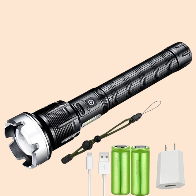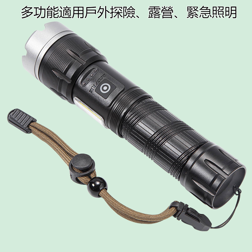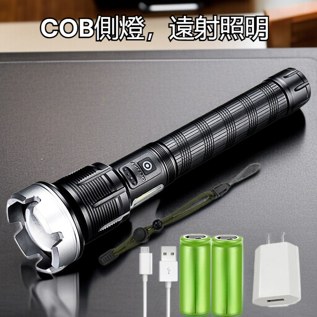 伸縮P90強光手電筒,採用P70燈芯,強光變焦設計,COB側燈,遠射照明,多功能適用戶外探險、露營、緊急照明。